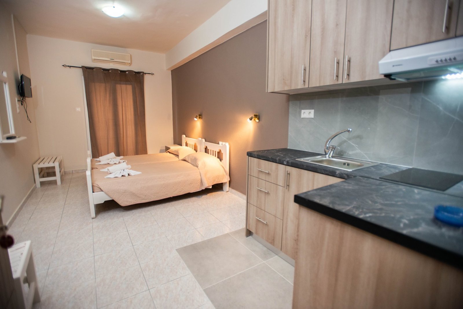 Επιπλέον, αυτά διαθέτουν ιδιωτικό μπάνιο, ντουλάπες, κλινοσκεπάσματα, πετσέτες, δορυφορική τηλεόραση, τα studio προσφέρουν και δυνατότητα προετοιμασίας γευμάτων με μικρά πολυκούζινα.